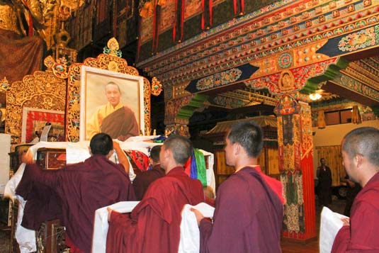 Gyalwang Karmapa Orgyen Drodul Trinley Dorje was celebrated universally on the 26th of June 2015. On this very auspicious day, representatives of Palpung Sherabling Monastic Seat, Tulku Rinpoches and Khenpos were sent to Gyutoed Monastery to offer the Mandala and Scarfs from Guru Vajradhara Chamgon Kenting Tai Situpa to H.H Gyalwang Karmapa since Guru Vajradhara was in retreat. The sangha of Palpung Sherabling Monastic seat celebrated the traditional ceremonial offering with Mandala and long life prayers and every individual offered scarfs to the Throne of His Holiness. The traditional tea ceremony was served for the gathering. According to the instructions and blessing of Guru Vajradhara, a grand project of planting trees was started on the day of His Holiness' Birthday.