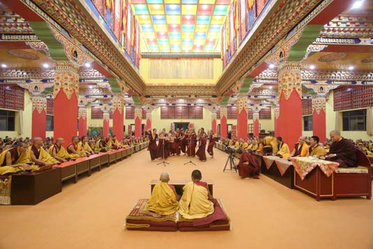 By the blessing of Guru Vajradhara the 12th Chamgon Kenting Tai Situpa, in the evening of the 12th September 2015, the last day of this year’s summer retreat at Palpung Lungrig Jampal Ling Institute of Higher Buddhist Studies of Palpung Sherabling Monastic seat, monks from Tsogdra, monks from Shedra and young Tulkus all together performed and demonstrated their results of study on various subjects of philosophy such as debating, discussion and giving individual explanations of different topics. This unique Dharma function by students of Shedra, Tsogdra (puja monks) and Tulkus was performed for the first time at Palpung Sherabling Monastic Seat and it could even be the first time in any Tibetan Buddhist tradition. Guru Vajradhara the 12th Chamgon Kenting Tai Situpa blessed this gathering and spent the whole night blessing these auspicious Dharma activities on the last day of this year’s summer retreat at the main shrine hall of Palpung Lungrig Jampal Ling Institute of Higher Buddhist Studies.