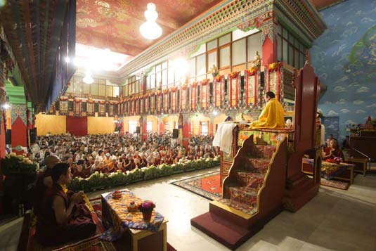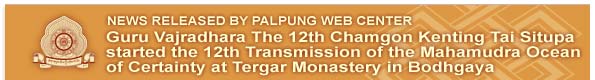 From the 1st of April 2016 Guru Vajradhara The 12th Chamgon Kenting Tai Situpa began the auspicious Mahamudra transmission, using the text called Mahamudra Ocean of Certainty at the main shrine hall of Tergar Monastery. This transmission is the first year of a seven-year transmission and practice and will be done in accordance with the unbroken lineage of Mahamudra. There had been a long-standing request by many students from various countries who are fortunate enough for this holy venture to happen this very year at the holy place of Bodhgaya, in Tergar monastery. Among the receivers of this profound transmission are foremost The Very Venerable Yongey Mingyur Rinpoche, Very Venerable Bo Gangkar Rinpoche, Very Venerable Gyalton Rinpoche, Venerable Pong Re Rinpoche, Venerable Drub Gyu Rinpoche and Venerable Tsewang Kuncheb Rinpoche, prominent Rinpoches and spiritual heart sons of Guru Vajradhara Chamgon Kenting Tai Situpa from Palpung Sherabling Monastic Seat. This transmission of the practice lineage is scheduled for 7 days with extensive transmission and practices.