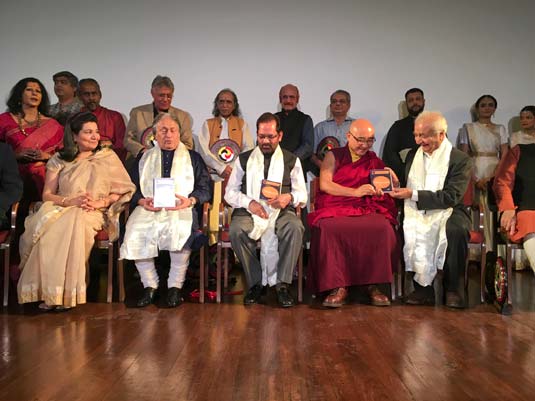 0n the evening of November 1st, 2016, at India International Center Auditorium, India Harmony Foundation, ASAVARI and Palpung Sherabling Monastic Seat of Palpung Munishasan Dharma Chakra Sangh jointly organized a screening event for the launch of "SHUNYATA," a unique performance and an interfaith dialogue essaying the philosophy of Lord Buddha through dance and music filmed and directed by Aparna Sanyal. "SHUNYATA," when Kathak met Cham, is weaved under the creative concept of the fusion between Kathak, the classic Indian dance and Cham, the Tibetan Buddhist chants and sacred dances. "SHUNYATA" features Grammy Award Winning Buddhist monks of Palpung Sherabling Monastic Seat and the Padmashri & SNA awardee, Kathak Guru Shovana Narayan with her ASAVARI Repertory. There were large gathering audience attended the event. The main guests, Shri Mukhtar Abbas Naqvi, Honorable Minister of State of Minority Affairs and Parliamentary Affairs of Government of India, Venerable Tenam Lama Shastri on behalf of Guru Vajradhara Chamgon Kenting Tai Situpa and the respected Padma Vibhushan award recipient Ustad Amjad Ali Khan Saab lit the light together. Venerable Tenam Lama Shastri welcomed Honorable Minister and the respected Ustad Amjad Ali Khan Saab with a traditional Tibetan scarf and presented them each a memory medallion specially designed by Guru Vahradhara Chamgon Kenting Tai Situpa for SHUNYATA. The symbolic meaning of the design behind the logo is for harmony of harmony. It represents the unity and the harmony for all aspects of human beings and all human races of different colors. Honorable Minister, Venerable Tenam Lama Shastri and Ustad Amjad Ali Khan then distributed the remaining memory medallions to the rest of the eminent guests. The three main guests together performed the DVD opening ceremony and each delivered a short speech in the order of Mr. Asad Amjad Ali Khan, Venrable Lama Tenam Shastri and Honourable Minister. The screening of the director’s introduction regarding the making of "SHUNYATA" followed. Afterwards, short prayers were conducted by Palpung Sherabling monks and Kathak dance performed by Shovana Narayan with her team. The closing ceremony speech was delivered by India Harmony Foundation at the end of the event.