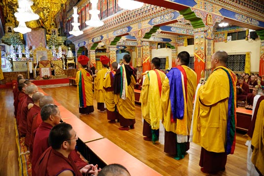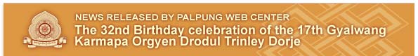 The 32nd Birthday celebration of 17th Gyalwang Karmapa Orgyen Drodul Trinley Dorje elaborately celebrated here in Palpung Sherabling Monastic Seat in the morning of 26 June 2017. The traditional ceremonial offerings with Mandala, body, speech and mind, chanting long life prayers were preceded and every individual offered scarfs to the Throne of His Holiness. The traditional tea ceremony was served for the gathering. According to the instructions and blessing of Guru Vajradhara, a grand project of planting trees was started on the day of His Holiness' Birthday. At 3:00 pm the cake cutting ceremony was also done blissfully.