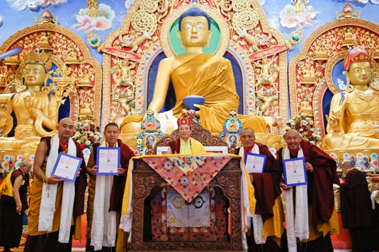 On the 27th of June 2017, Palpung Lungrig Jampal Ling Buddhist Higher Studies of Palpung Sherabling Monastic Seat held a grand event on the 4th day of the 5th month according to the Kalachakra calendar. It is the day when Buddha turned the first wheel of dharma which is the teaching commonly known as the Four Noble Truths. On this very auspicious day, Guru Vajradhara The 12th Chamgon Kenting Tai Situpa appointed five new Khenpo and present them Lopon certificate. 1. Kunchok Tenzin 2. Karma Tashi. 3. Karma Tsultrim Sangpo. 4. Karma Sopa. 5. Kunchok Lhakyab. Chosing was appointed new discipline master of Shedra with two new assistants Tsenchok and Tenzin Phuntsok. Annual academic result of Palpung university of Buddhist science declared and Guru Vajradhara The 12th Chamgon Kenting Tai Situpa presented to award to toppers. Jamyang choedak was appointed as the director, Lama Sherab Drimey as new discipline master and Karma Yonten as assistant discipline master of Palpung university of Buddhist science. Guru vajradhara also present prizes to the annual toppers of Tsokdra acadamic studies. Omze Thinley Gyurmey was appointed as the education supervisor of Tsokdra department. Rinchen Dawa, Nyima Dorjee and Karma Kunsang were appointed as new junior chanting master. Karma Lhawang was appointed as new Vajra Nyitham master (Champon). Above all were done under the blessing of Guru Vajradhara Chamgon Kenting Tai Situpa. All of the sangha of Palpung Sherabling Monastic Seat attended this major event at the main shrine hall of Palpung Lungrig Jampal Ling College of Higher Buddhist Studies and also received teachings and pith instructions from Guru Vajradhara.