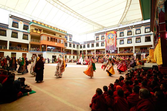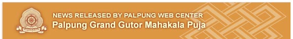 In the 18th century, the 8th Tai Situpa established the Palpung Monastic Seat in Tibet, heralding the beginning of the Palpung tradition. As an aspect of that tradition, the Grand Gutor Mahakala puja was performed at Palpung Monastic Seat every year at the end of the twelfth Tibetan month, a time when Dharma protectors are most active. This puja is a practice of invoking the activity of the wisdom Dharma protectors Mahakala and Mahakali, along with their retinue. Its purpose is to protect the Buddha’s teachings of all traditions, to benefit all beings along with the world we live in and to pacify sickness, famine, wars and natural disasters. This tradition continues to February 14 at the Palpung Sherabling Monastic Seat in India. From February 7 onwards, Rinpoches, Lamas, Khenpos, monks and nuns performed the extensive Gutor Mahakala puja day and night without interruption. As part of this puja, there is also a Grand Gutor Mahakala lama dance, which liberates upon seeing. On February 13, they performed the first part of this lama dance without masks and on the next day, they performed the second part, this time with masks. This was followed by the conclusion of the Gutor Mahakala puja, the ritual of averting obstacles, which began with casting out the torma and ended with a fire puja.