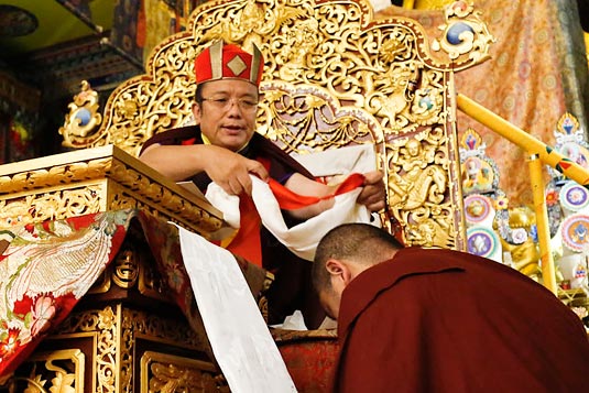 On February 25, in front of the assembly of the entire monastic community, Guru Vajradhara the 12th Chamgon Kenting Tai Situpa appointed thirty new staff members of the Palpung Sherabling Monastic Seat and its numerous branches. These included a new discipline master and assistant disciplinarians, a lama dance master, a shrine master, resident lamas for the Dharma Centres, new teachers for the Monastic Primary School and new lamas for the Dharma protector temples. Guru Vajradhara complimented the outgoing staff for their sincere and devoted service and offered heartfelt advice and guidance to the new staff about how to fulfil their responsibilities in supporting the spiritual activities of the Monastic Seat.