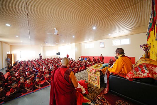 On March 13, Guru Vajradhara the 12th Chamgon Tai Situpa presided over the announcement of the annual exam results at the Monastic Primary School of the Palpung Sherabling Monastic Seat. The event included the inauguration of a new library for primary school children. Guru Vajradhara congratulated the children for successfully passing their exams and gave them a talk about the value of education, emphasising the importance of the study of Tibetan language.