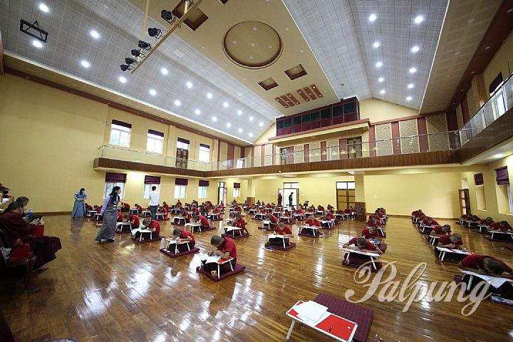 From July 30 to August 8, 2022, the midterm examination at Palpung Sherabling Monastic Seat's Riglam Kyetsal Monastic Primary School was carried out under the supervision of the school’s hard-working and caring teachers at the school's assembly hall over nine days. Young students from Upper Kindergarten up to Class 6 sat for written and oral exams on Tibetan language and orthography, as well as written exams on what they had learned over the past semester during classes on English, Hindi, mathematics, and modern sciences.