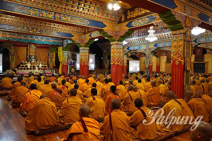 On August 12, 2022, to celebrate the parinirvana of Lord Gampopa, elaborate offerings of the five enjoyments and ganachakra substances were arranged in Palpung Sherabling Monastic Seat's main shrine hall. The monastic seat's tulkus, lamas, khenpos, and its entire monastic community then joined the online celebration with the recitation of Gampopa Guru Sadhana, along with a ganachakra. The commemoration of lives and activities of the forefathers of the Kagyu lineage was concluded with an offering of butter lamps and traditional "Full Moon" ceremonial music on the monastery's rooftop.