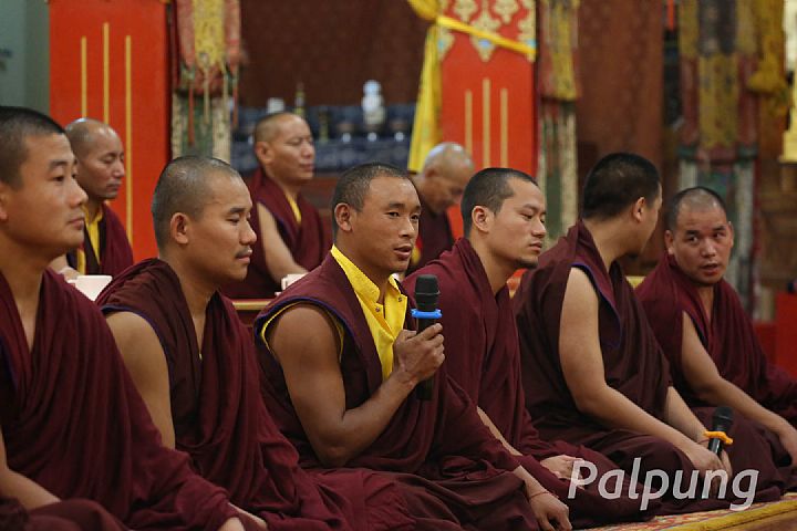 As a conclusion to this year's classes on philosophy and Buddhist sciences at Palpung Sherabling Tantric College, on September 12, 2022,in the presence of Khenpo Thubten Karma, the head Khenpo of the monastic college, along with the monastic seat’s lamas, chanting masters, discipline masters, khenpos, acharyas, and teachers, the tantric college students engaged in discussions on key points of various subjects, such as Situ’s Great Commentary on "The Thirty Verses" and "The Guide to Signs" and other major and minor treatises on Tibetan grammar, poetics, The Guide to the Bodhisattva's Way of Life, The Gateway to Knowledge, Ascertaining the Three Vows, and other treatises on inner sciences. The students also presented discourses, commentaries, and comparative discussions on these topics.