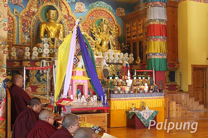 From January 18, 2023, Palpung YeshiRabgyeling Nunnery's khenpos, along with the monastic seat's chief chanting master and the nuns' community, performed rituals for the welfare of the Buddha's teachings and sentient beings. Since Guru Vajradhara His Holiness the 12thChamgon Kenting Tai Situpa is about to reach the age of seventy, they conducted various longevity rituals of both sutra and tantra, such as one hundred thousand recitations of "The Twenty-One Praises to Tara," reading the extensive, middle-length, and concise versions of "The Prajnaparamita Sutra," and performing the Tara That Averts Obstacles and smoke offering rituals.
