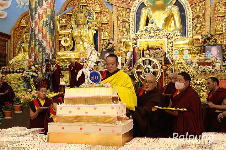 The Palpung Sherabling Monastic College's khenpos, acharyas, and graduates, along with the monastic seat's entire monastic community, requested to offer a long life ceremony to express their appreciation of Guru Vajradhara His Holiness the 12th Chamgon Kenting Tai Situpa's immense kindness. To fulfil this aspiration, the monastic seat's community, Tibetan from Bir, and devotees from Chango village in Kinnaur and Mön in Arunachal Pradesh organized Guru Vajradhara's birthday celebration, while the monastic community performed the extensive long life sadhana for his longevity.
