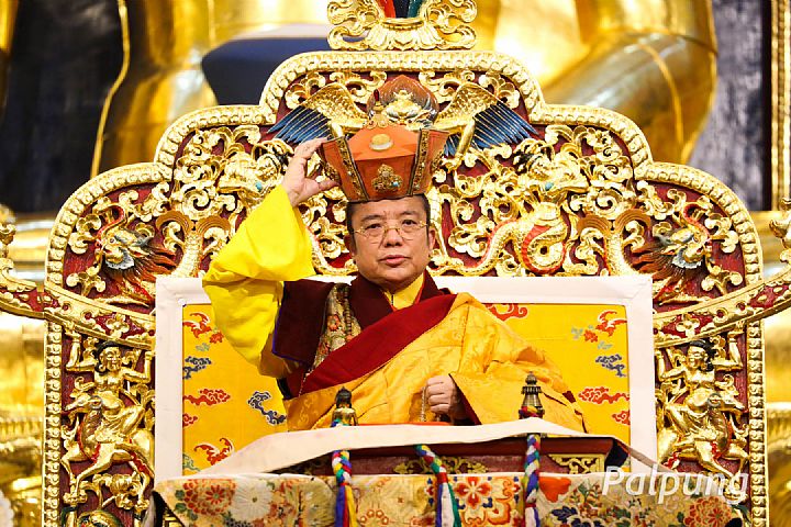 This was followed by Guru Vajradhara His Holiness Chamgon Kenting Tai Situpa conducting the actual Red Crown Ceremony, bestowing the long life empowerment of Machig Drubpe Gyalmo's tradition, and giving a teaching on the importance of doing our best to become a good human being and an authentic Dharma practitioner with a stable character, good heart, respect for the law of cause and result, and pure perception towards all Buddha's teachings.