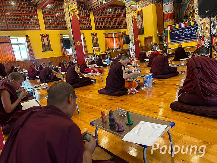 This year's visual transmission classes on the performance of rituals have been successfully completed as the result of collective efforts of the nunnery's teachers and students. Following that, from June 5 to 8, 2023 the nunnery's yearly ritual performance examination was conducted for four days under careful supervision of its khenpos, staff, and visual transmission teachers. The ritual performance exams included memorizing liturgical procedures for daily practices and regular ceremonies, making tormas and torma ornaments along with their arrangements, as well as playing various ritual instruments, such as white conches, gyaling trumpets, long horns, thigh-bone trumpets, drums, cymbals, and sacred dances.