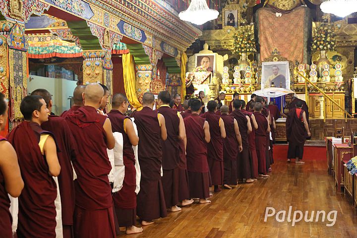 The ceremony began at 8 am at the main shrine hall with "The Prayer of the Eight Noble Auspicious Ones," followed by an offering of a mandala along with representations of body, speech, and mind in front of a sacred image of His Holiness, a tea and sweet rice offering, and long-life prayers. After that, everyone offered a white ceremonial scarf to Gyalwang Karmapa’s sacred image, which liberates upon seeing. The program continued with a clean-up of the monastic seat's indoor spaces and environment.