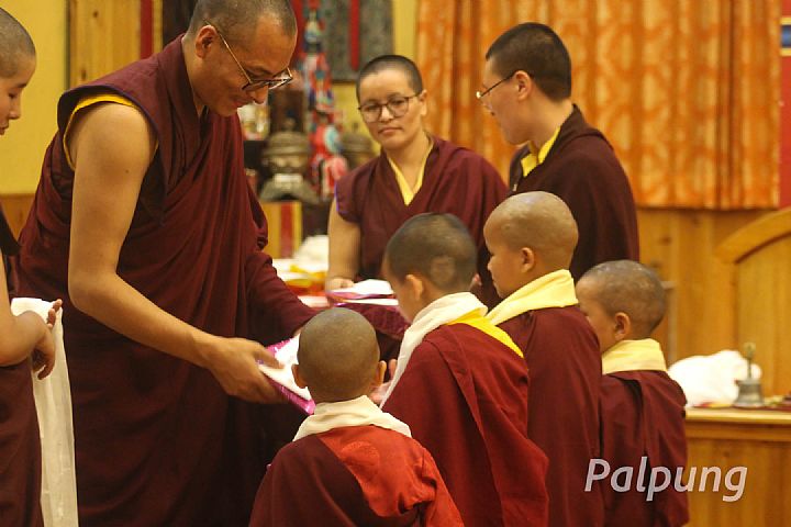 On June 18, 2023, the khenpos, teachers, staff, and the entire community of nuns gathered in the main temple of the Palpung Yeshi Rabgye Ling Nunnery, and after the chanting of auspicious verses and prayers, the lama and khenpos in charge of the nunnery rewarded the students who achieved the best results in the 2022 annual examination, which comprised written and oral exams on several treatises on the inner science of mind, English, mathematics, and the foundations of Buddhism.