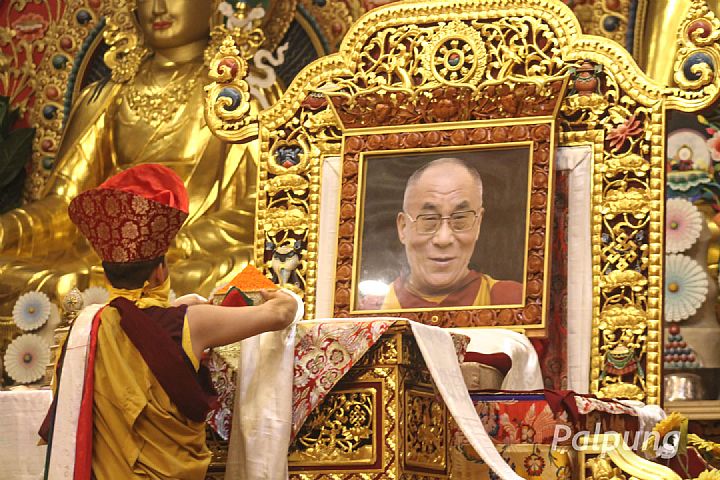 The nunnery's khenpos, teachers, and staff began the ceremony by chanting verses of auspiciousness, which was followed by an offering of a mandala along with representations of body, speech, and mind in front of a sacred image of His Holiness, a tea and sweet rice offering, and a longevity practice. After that, everyone offered a white ceremonial scarf to His Holiness the Dalai Lama's sacred image, which liberates upon seeing. The program concluded with a contemporary birthday celebration with an offering of birthday cakes and sweets along with chanting auspicious verses.