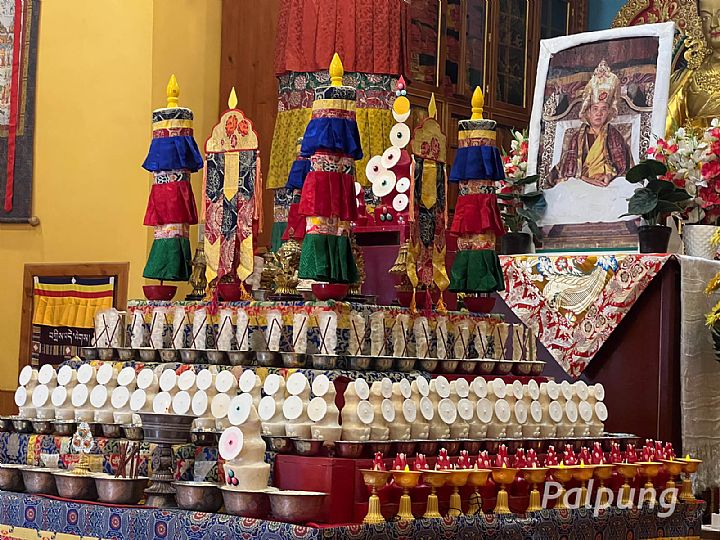 According to the Tibetan calendar October 22, 2023, the 8th day of the 9th lunar month, marked the 42nd mahaparinirvana anniversary of His Holiness the 16th Gyalwang Karmapa Rangjung Rigpe Dorje, the master of the practice lineage teachings and the embodiment of Avalokiteshvara. To recall the life and qualities of the 16th Karmapa's three secrets, on that day the Palpung Yeshi Rabgye Ling Nunnery's khenpos and the nuns' community performed Gyalwang Rigpe Dorje's guru sadhana "Opening the Door to Wisdom" complete with an elaborate ganachakra offering and extensive aspiration prayers.