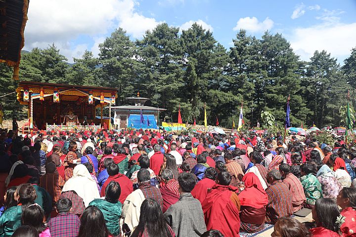 On September 1, Guru Vajradhara conferred the transmission of Phowa and a longevity empowerment to several thousand devotees at Dawathang Lhakhang in Bumthang. On the following day, he transmitted Guru Rinpoche's mantra at Tangsibji Lhakhang (Zabsang Tharlam Lhundrub Ling Monastery).
