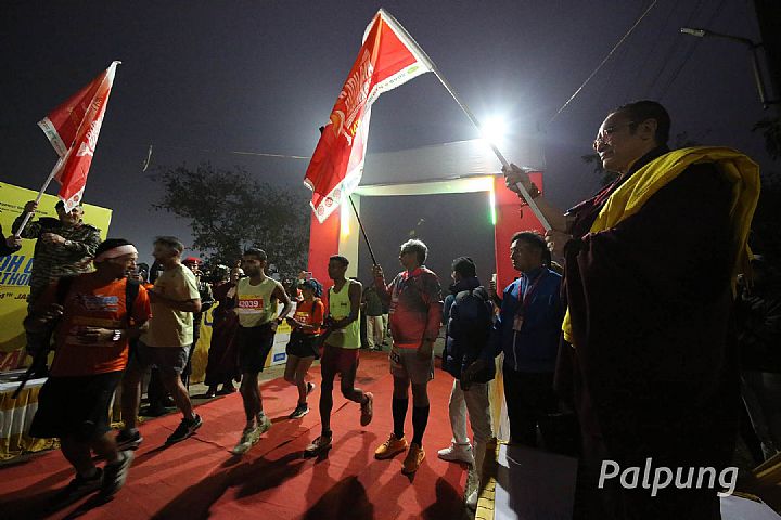 In response to an invitation from the International Buddhist Confederation (IBC), Guru Vajradhara the 12th Chamgon Kenting Tai Situpa visited Magadha University at 5 am on January 14, 2024. There, the IBC and Bodh Gaya Marathon Committee organized the inaugural ceremony for the first-ever Bodh Gaya Marathon—Run for Global Peace. The event aimed to promote the Buddha’s teachings and various sacred sites associated with the Buddha's life. Runners from six countries participated in this run for peace and unity. Guru Vajradhara served as the Chief Guest at the inaugural ceremony. He flagged off the marathon and, accompanied by the monastic seat's monks, chanted verses of auspiciousness and prayers for the welfare of the Dharma and sentient beings.