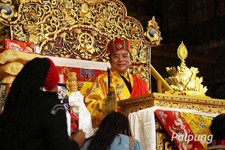 When the ritual was completed, the monastics and laity who reside at the monastery were seated in rows according to the traditional seating arrangement. Following that, Guru Vajradhara arrived at the temple and everyone enjoyed an auspicious feast of ceremonial tea and sweet rice, along with traditional elaborate arrangements of food offerings. The auspicious and joyful Male Wood Dragon Losar celebration was concluded by Guru Vajradhara bestowing individual blessings to everyone present.