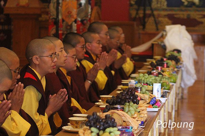 When the ritual was completed, the nunnery's teachers and all the nuns offered a ceremonial scarf in front of Guru Vajradhara His Holiness Chamgon Kenting Tai Situpa's image, after which everyone was seated in rows according to the traditional seating arrangement to enjoy an auspicious feast of ceremonial tea and sweet rice, along with traditional elaborate arrangements of food offerings.