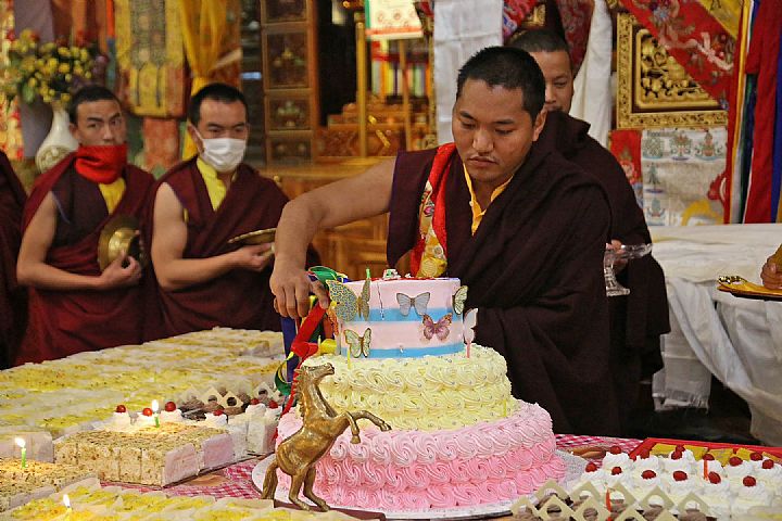 In the morning of February 17, 2024, which marks 71 years since Guru Vajradhara His Holiness the 12th Chamgon Kenting Tai Situpa's physical manifestation was born on this Earth, his birthday celebration, began with the entire monastic community of Palpung Sherabling Monastic Seat performing a smoke offering ritual, followed by the offering of a mandala along with representations of the Buddha's body, speech, and mind in front of Guru Vajradhara's throne. After that, traditional tea and sweet rice were distributed to everyone present. Guru Vajradhara's birthday celebration was then concluded with a contemporary celebration, which included birthday cakes, auspicious wishes, and longevity prayers.
