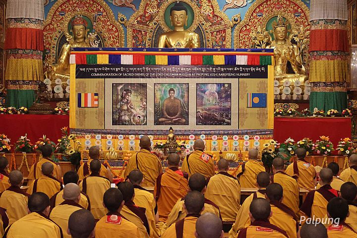 At Palpung Yeshi Rabgye Ling Nunnery, the commemoration and celebration of Lord Buddha's life and qualities began in the morning with the nunnery's khenpos, teachers, and nuns performing a ceremony for the purification and restoration of the three sets of vows, followed by a ritual of offerings and prayers dedicated to the Sixteen Arhats.