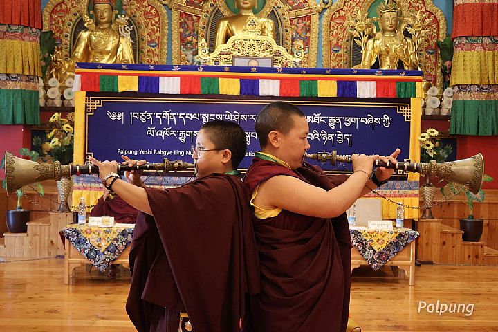 This year's visual transmission classes on the performance of rituals have been successfully completed as the result of collective efforts of the nunnery's teachers and students. Following that, from May 29 to June 1, 2024 the nunnery's yearly ritual performance examination was conducted for four days under careful supervision of its khenpos, staff, and visual transmission teachers. The ritual performance exams included memorizing liturgical procedures for daily practices and regular ceremonies, making tormas and torma ornaments along with their arrangements, as well as playing various ritual instruments, such as gyaling trumpets, long horns, thigh-bone trumpets, drums, cymbals, Mandala drawings, and sacred dances.
