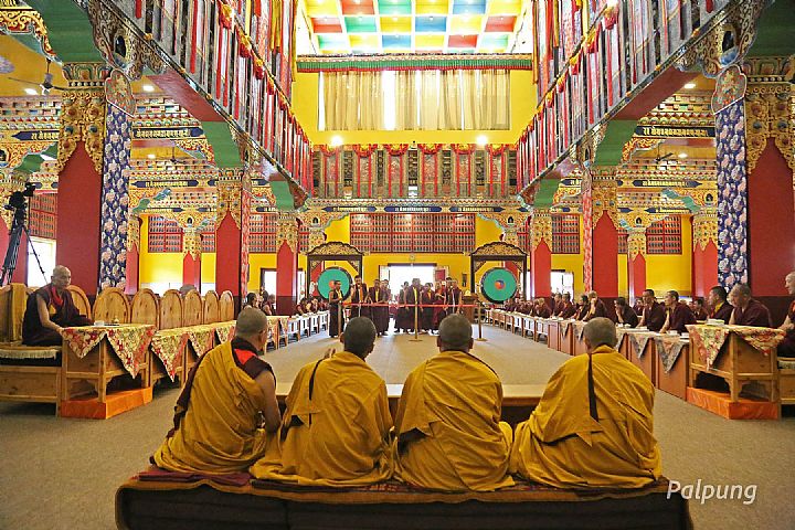 On August 8, 2024, the auspicious day that marks the Buddha's first turning of the Wheel of Dharma, the teaching on the Four Noble Truths, Guru Vajradhara H.H. the 12th Chamgon Kenting Tai Situpa was escorted to the main shrine hall of monastic college by a traditional procession of lamas carrying incense. As soon as Guru Vajradhara ascended onto the throne, a mandala along with the representations of body, speech and mind, accompanied by the chanting of the auspicious verses, was offered to him, and traditional tea and sweet rice were offered to everyone present. The ceremony continued with a presentation of the Five Excellencies, debates on the five major treatises by the newly appointed khenpos, and a discussion on tantra by the 2024 graduates.